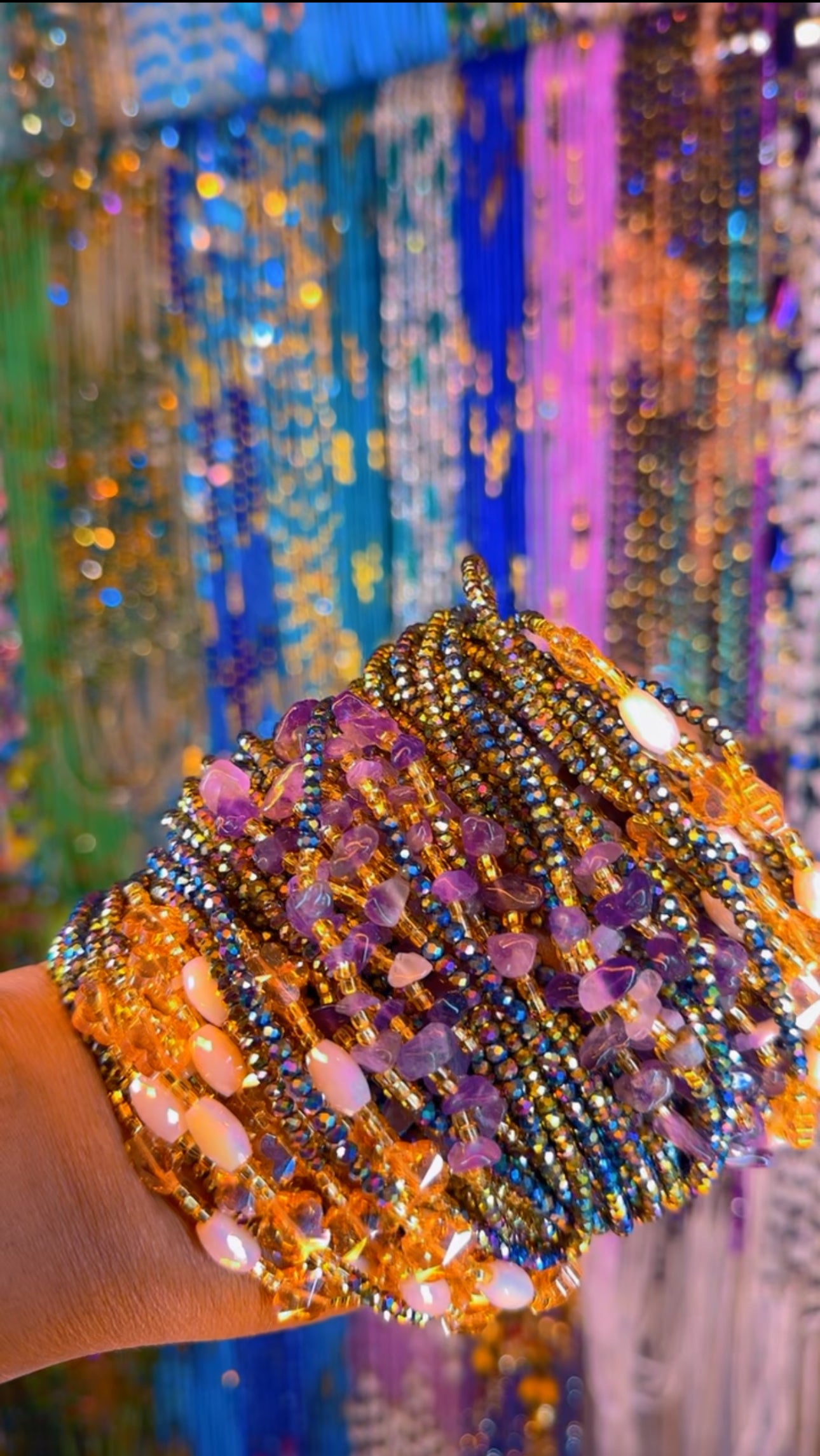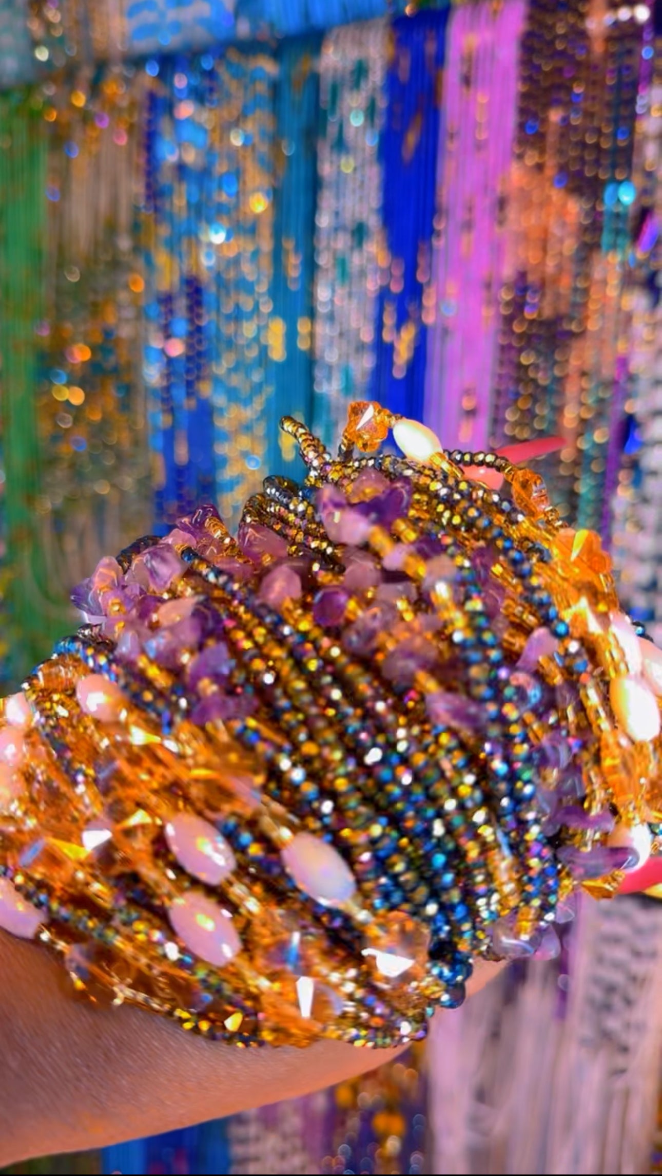 Let’s get high! What’s higher than your crown? Composed of the most dreamy iridescent purple glass beads, and Amethyst gemstones. Known to elevate you to your highest form of thought, self, and over all being. Amethyst symbolizes spirituality, calm, clarity, and intuition. Amethyst generates protection from negative influences, sobriety, and wise decision-making.